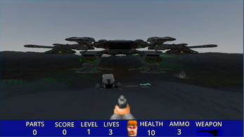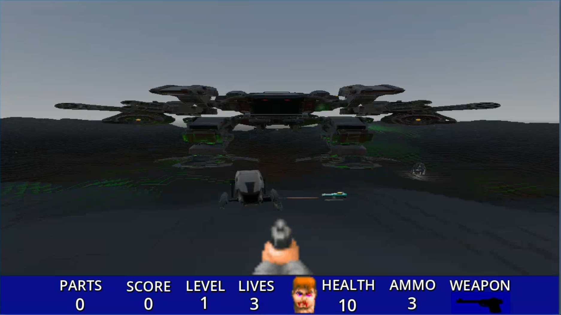 A game where you roam a planet, fighting robots. Larger robots drop parts, upon 6 parts - summon final boss or get a new life.